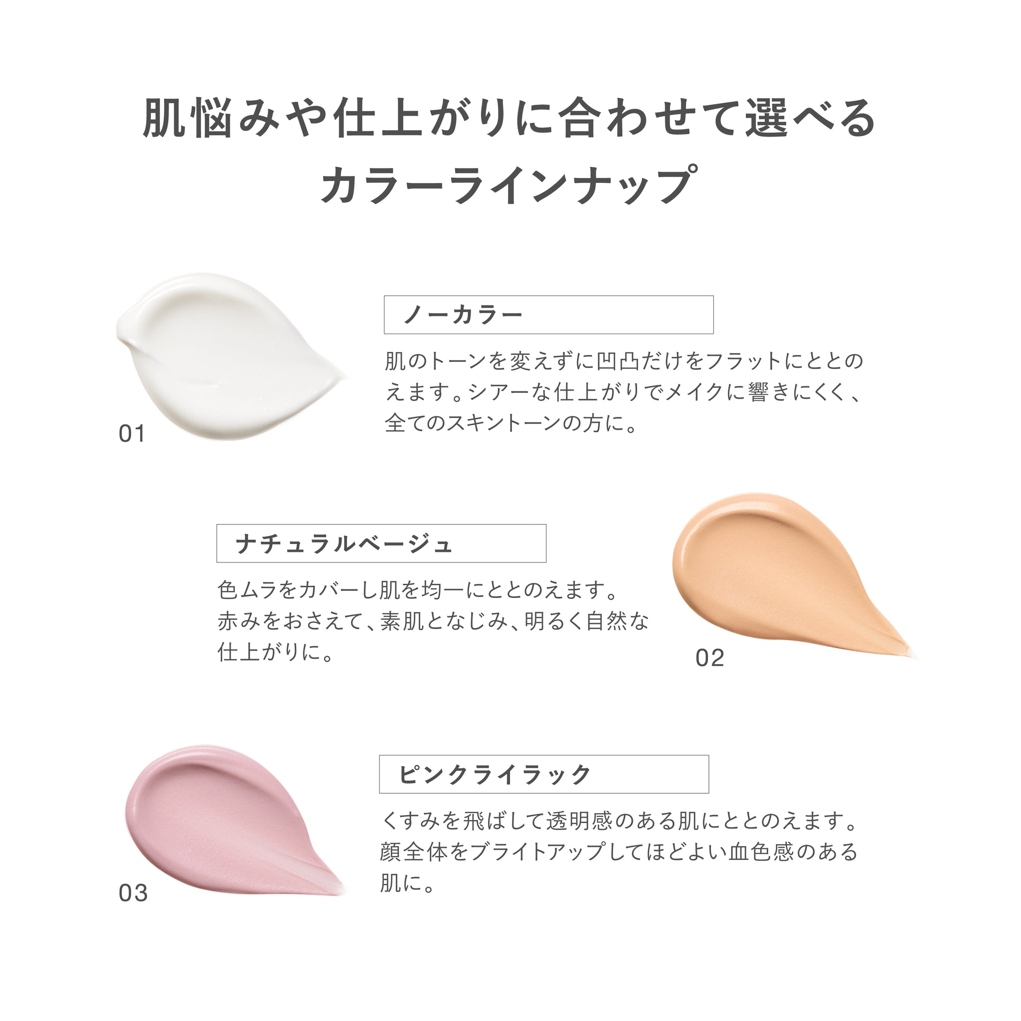 ・01 The colorless primer smooths out uneven skin surfaces without changing the skin tone. Its sheer formula does not interfere with makeup and is suitable for all skin tones.