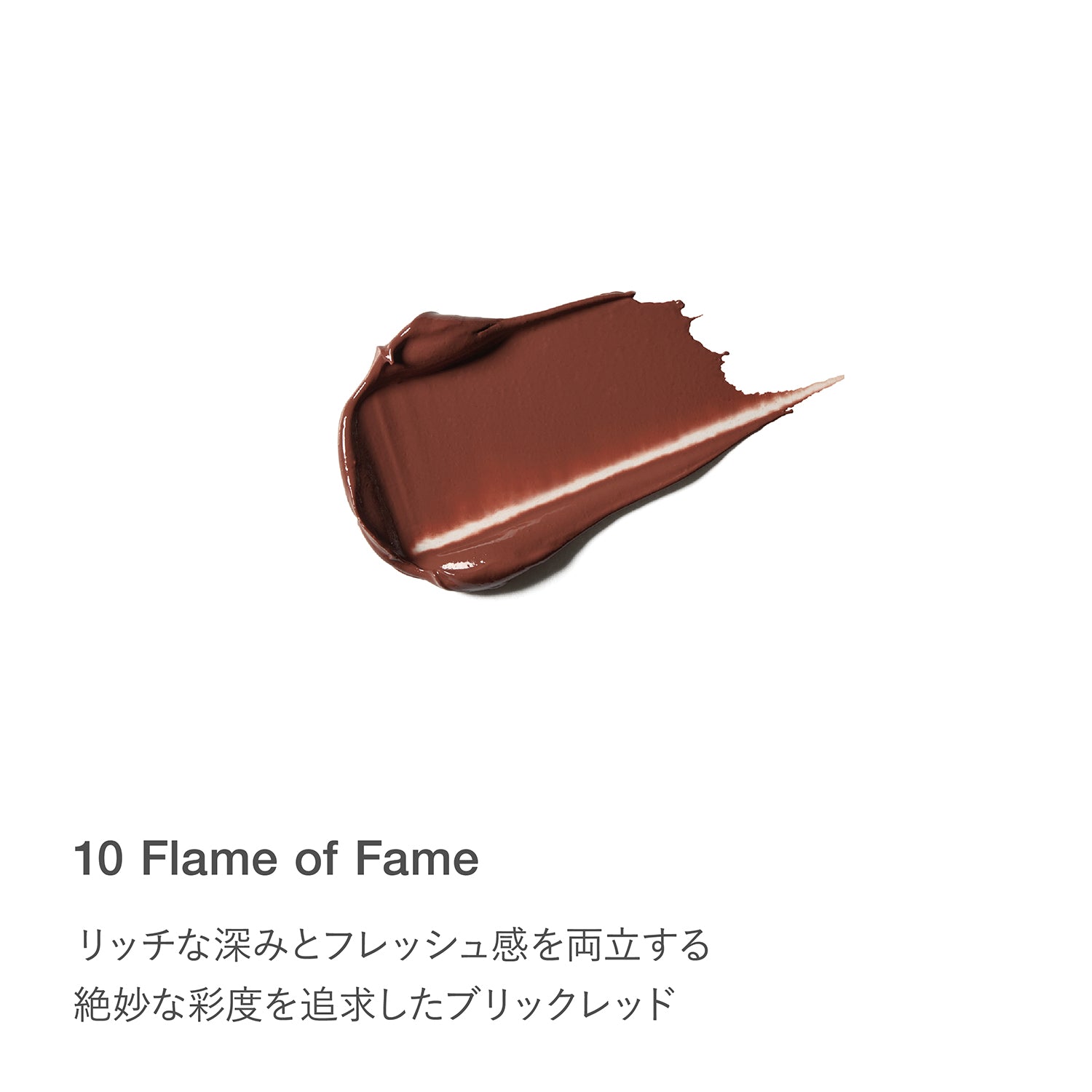 Brick red pursuing exquisite saturation that combines rich depth and freshness. A red lip that is not a classic will bring a new breeze to your style.
