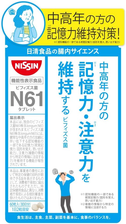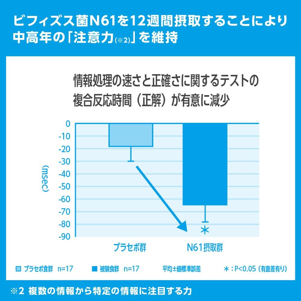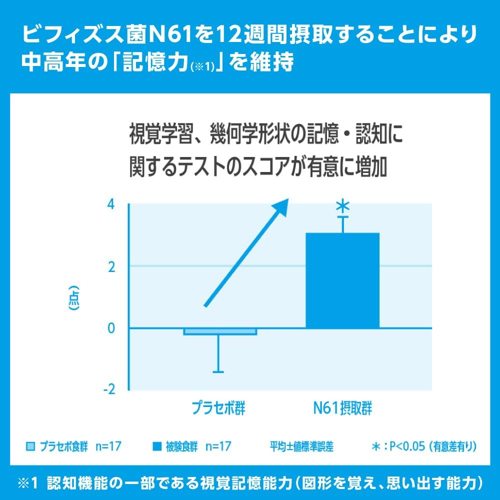 Bifidobacterium N61 strain: 10 billion units This product contains the unique Bifidobacterium N61 strain (B. longum N61), which has been reported to maintain memory (visual memory: the ability to remember and recall shapes) and attention (the ability to focus on specific information from multiple sources), which are cognitive functions that decline with age in healthy middle-aged and elderly people.